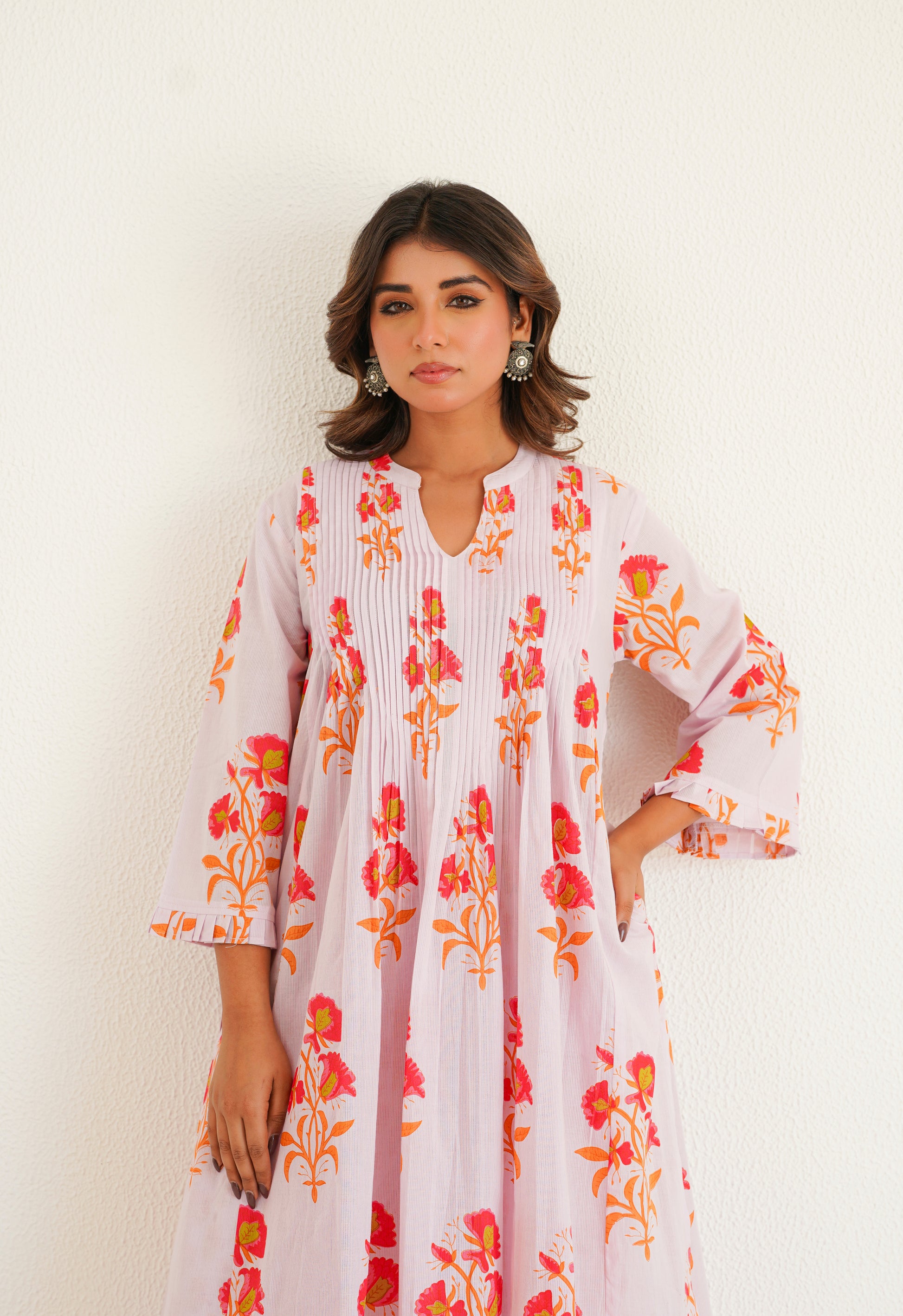 Step into elegance with our floral printed kurta ensemble, adorned with intricate Pintucks on the yok. This artisanal craftsmanship brings together tradition and contemporary style, making it a versatile addition to your wardrobe. Perfect for both casual outings and special occasions, the kurta's timeless design and subtle detailing ensure you stand out with effortless charm and grace.
