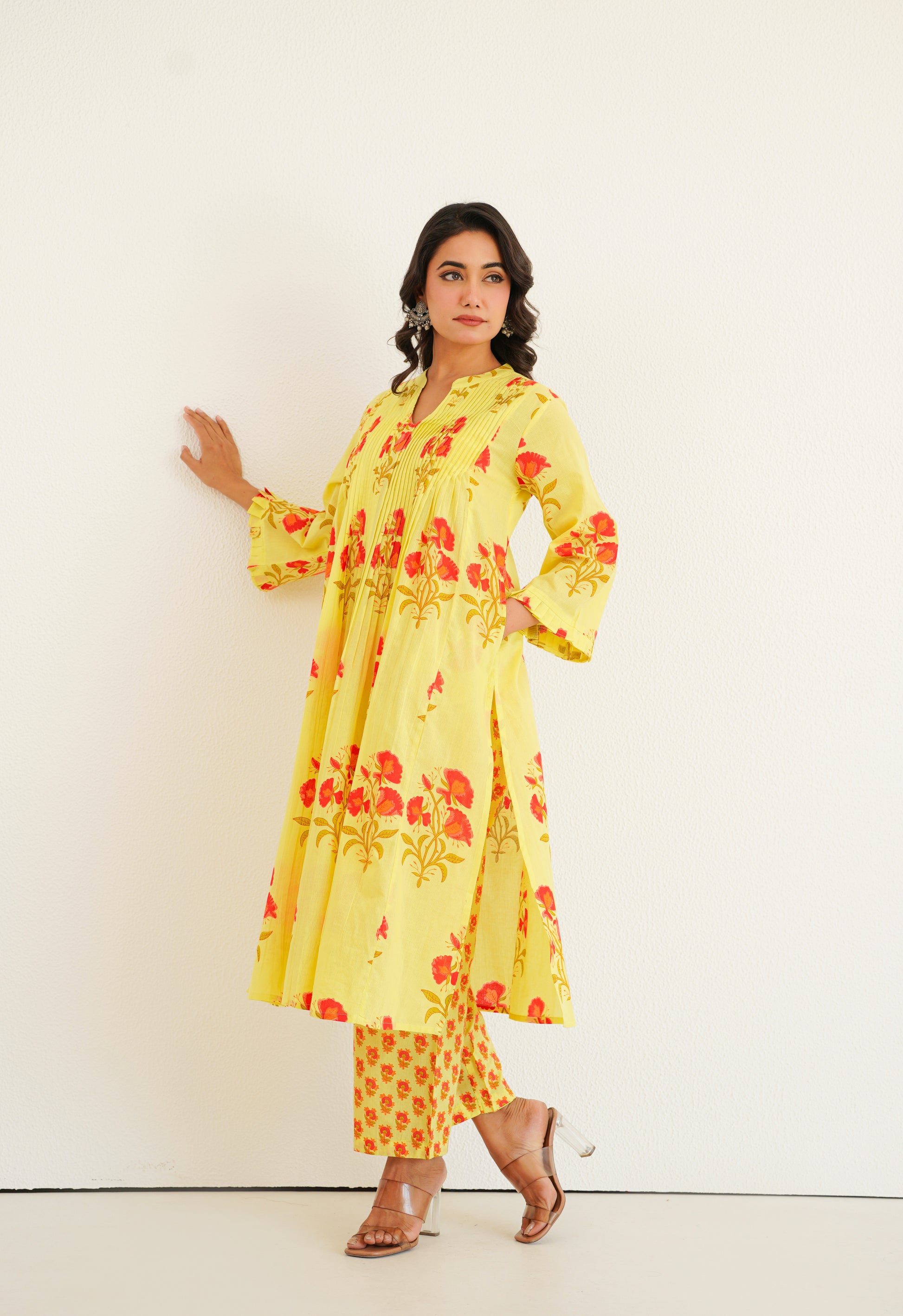 Step into elegance with our floral printed kurta ensemble, adorned with intricate Pintucks on the yok. This artisanal craftsmanship brings together tradition and contemporary style, making it a versatile addition to your wardrobe. Perfect for both casual outings and special occasions, the kurta's timeless design and subtle detailing ensure you stand out with effortless charm and grace.